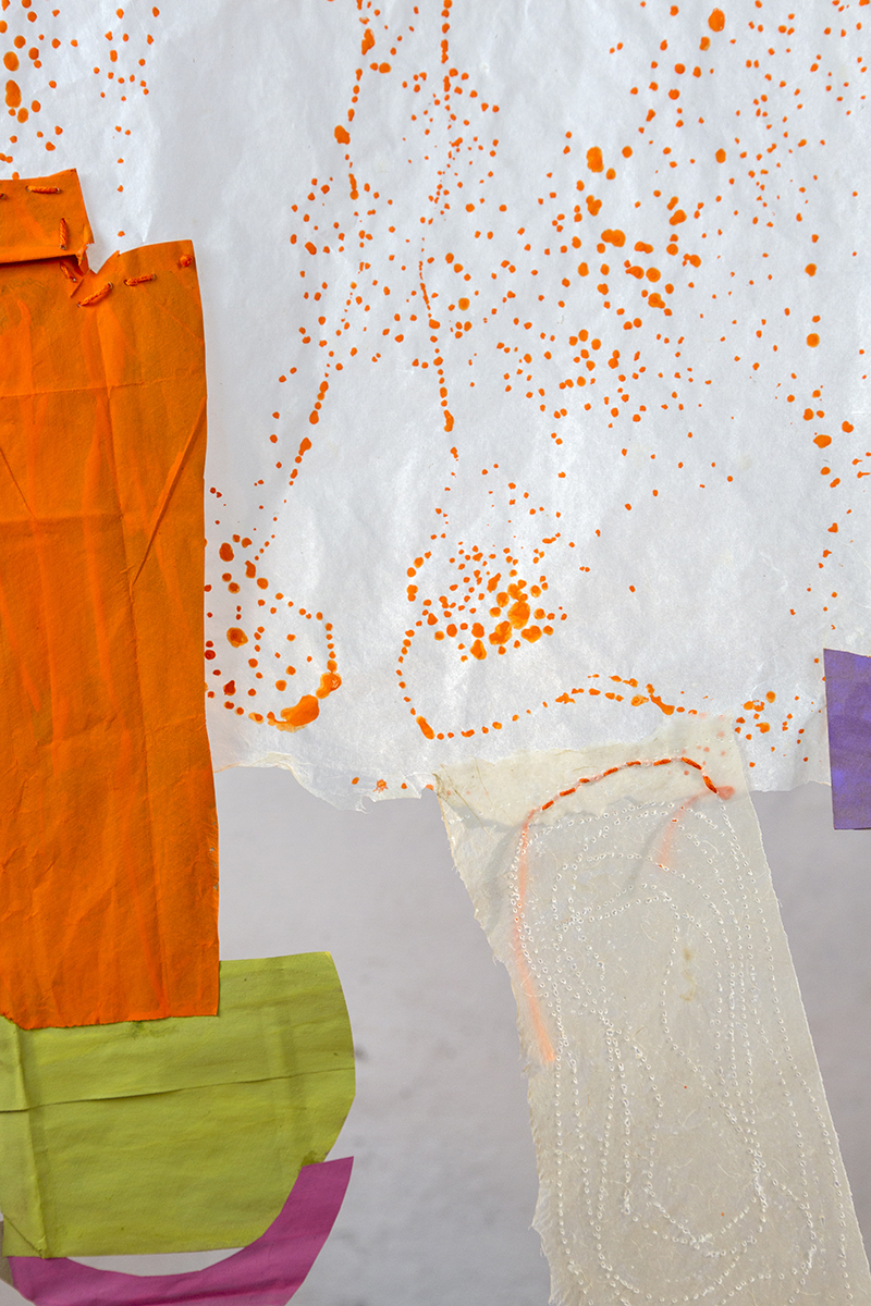 60” x 56” x 3”, 2019. handmade paper, paper, paperbag, sari material, gouache, wire, string, cardboard, embroidery floss, monofilament, tacks, Photography by Carlos Avendaño